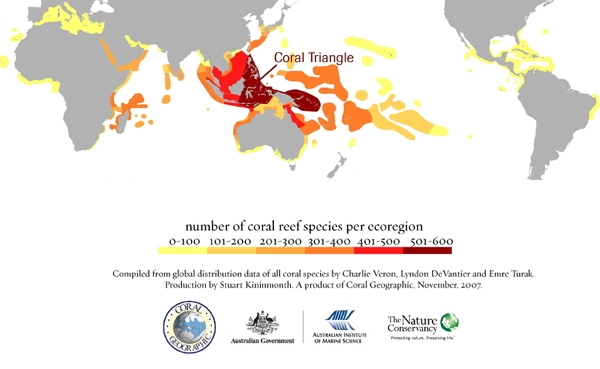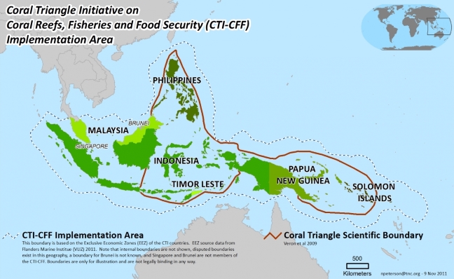 The Coral Triangle is an area encompassing almost 4 million square miles of ocean and coastal waters in Southeast Asia and the Pacific surrounding Indonesia, Malaysia, Papua New Guinea, the Philippines, Timor Leste, and the Solomon Islands. On May 15, 2009, the leaders of the six Coral Triangle countries met for a summit in Manado, Indonesia and signed the declaration launching the Coral Triangle Initiative (CTI) and endorsed its Regional Plan of Action. This event marked the culmination of a process launched by Indonesian President Yudhoyono in 2007 and supported by the United States to bring the six countries together to preserve the threatened marine, coastal, and small island ecosystems of the Coral Triangle region.