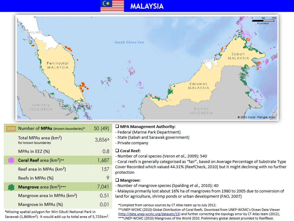 Marine Protected Areas are not a new concept for Malaysia. With a high concentration of biodiversity and islands supporting 1,687 square kilometers of reefs, Malaysia depends on the economic activity provided by fisheries. In the 1980s, areas around 22 islands were declared prohibited areas and later declared by law as marine parks.